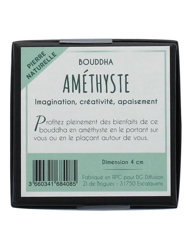 Pierre taillée en forme de Bouddha en pierre naturelle d'Améthyste. L'Améthyste dissipe les peurs irraisonnées et les phobies. Soutient toute lutte contre la dépendance physique ou psychique. Ouvre l’imaginaire et favorise les rêves. Offre un sommeil sain et réparateur à toute personne habituée aux rêves mais impose des nuits agitées aux autres. Développe l’intuition. Pour profiter pleinement des bienfaits de ce Bouddha en Améthyste, le porter sur soi ou le placer autour de soi.