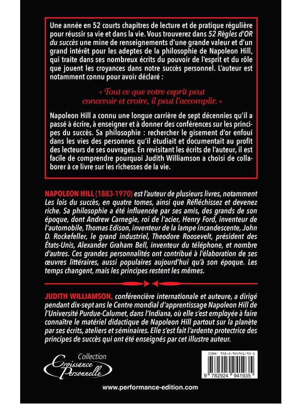 Une année en 52 courts chapitres de lecture et de pratique régulière pour réussir sa vie et dans la vie. Vous trouverez dans « 52 Règles d’Or du succès » une mine de renseignements d’une grande valeur et d’un grand intérêt pour les adeptes de la philosophie de Napoleon Hill, qui traite dans ses nomb