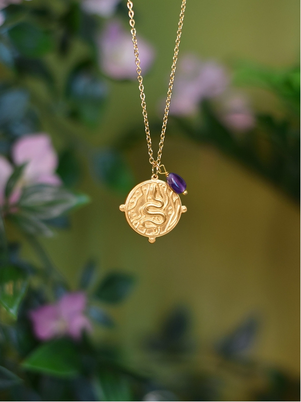 Ce collier, inspiré de l'astrologie chamanique amérindienne, incarne l'esprit du Serpent, l'animal totem qui vous représente si vous êtes né entre le 23 octobre et le 22 novembre. Symbole de transformation et de renouveau, le Serpent vous aidera à accueillir le changement pour vous permettre de vous réaliser pleinement. Pierre d'apaisement, l'améthyste dissipera vos peurs et vous apportera de la sérénité. Portez ce collier pour bénéficier de l'énergie transformatrice et libératrice du Serpent et renforcer votre capacité à évoluer.