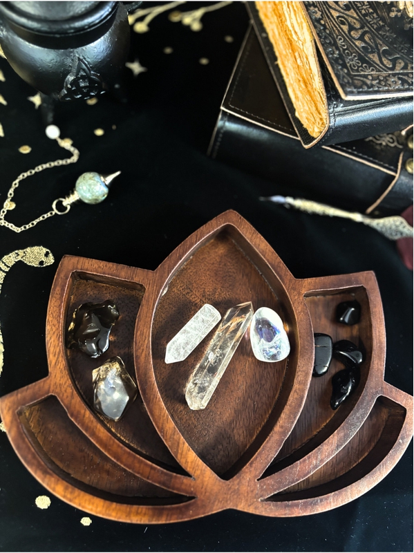Apportez une touche de sérénité à votre espace avec ce support en bois en forme de lotus. Évoquant la fleur de lotus, symbole de pureté et d'illumination, il est idéal pour mettre en valeur vos bijoux, pierres naturelles ou autres objets précieux.