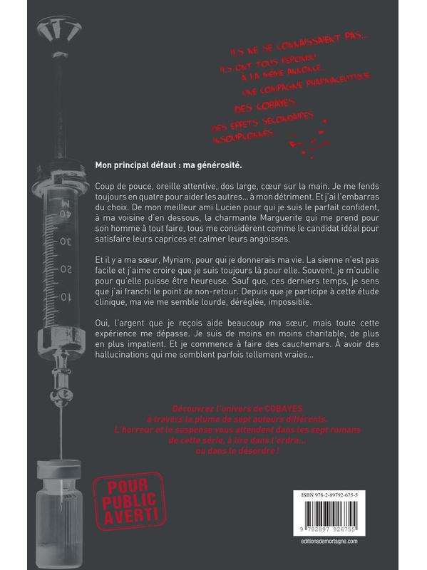 Mon principal défaut : ma générosité. Coup de pouce, oreille attentive, dos large, cœur sur la main. Je me fends toujours en quatre pour aider les autres... à mon détriment. Et j'ai l'embarras du choix. De mon meilleur ami Lucien pour qui je suis le parfait confident, à ma voisine d'en dessous, la charmante Marguerite qui me prend pour son homme à tout faire, tous me considèrent comme le candidat idéal pour satisfaire leurs caprices et calmer leurs angoisses. Et il y a ma sœur, Myriam, pour qui je donnerais ma vie. La sienne n'est pas facile et j'aime croire que je suis toujours là pour elle. Souvent, je m'oublie pour qu'elle puisse être heureuse. Sauf que, ces derniers temps, je sens que j'ai franchi le point de non-retour. Depuis que je participe à cette étude clinique, ma vie me semble lourde, déréglée, impossible. Oui, l'argent que je reçois aide beaucoup ma sœur, mais toute cette expérience me dépasse. Je suis de moins en moins charitable, de plus en plus impatient. Et je commence à faire des cauchemars. À avoir des hallucinations qui me semblent parfois tellement vraies...Dubé Martin Voir moins