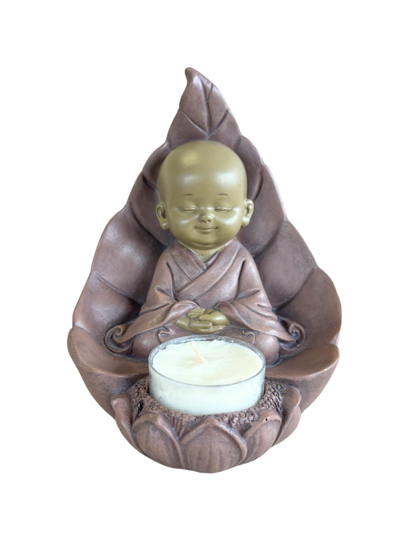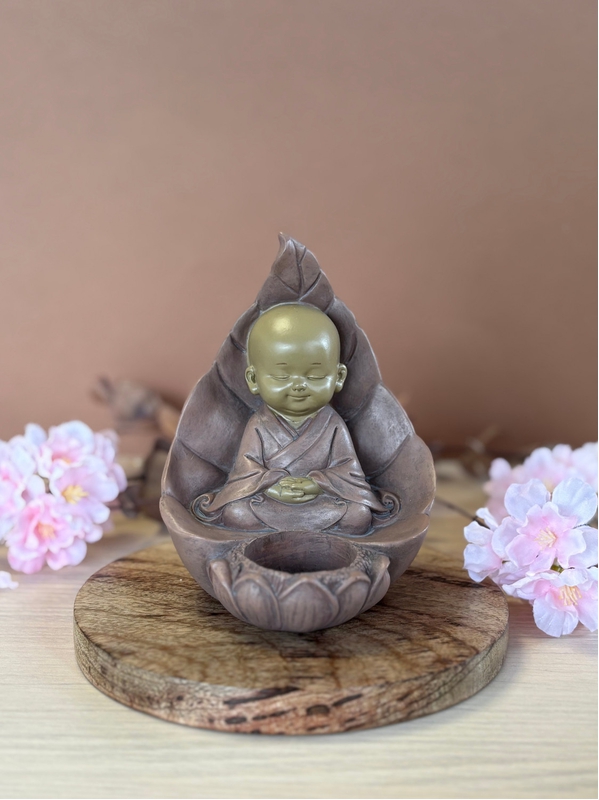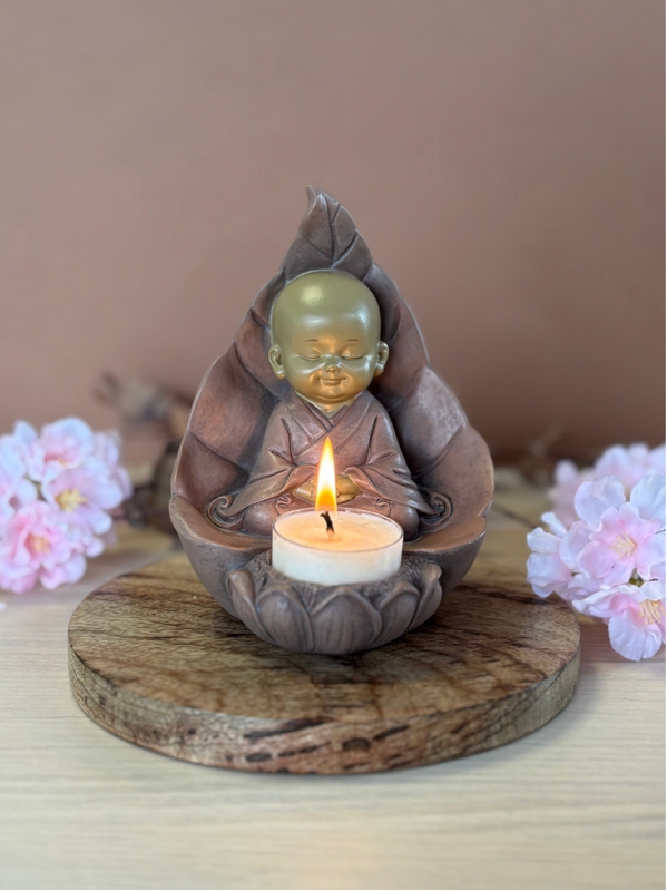 Enveloppé dans une feuille protectrice, les yeux clos, le moine repose dans une profonde méditation. Sa présence inspire la sérénité et la connexion à l'instant présent. Devant lui, un porte-bougie attend la flamme. Réalisé en résine grise, ce porte-bougie invite à la méditation, à l'écoute intérieure et à la paix profonde. Il trouve sa place dans une pièce de repos ou pendant des moments de calme et de méditation.