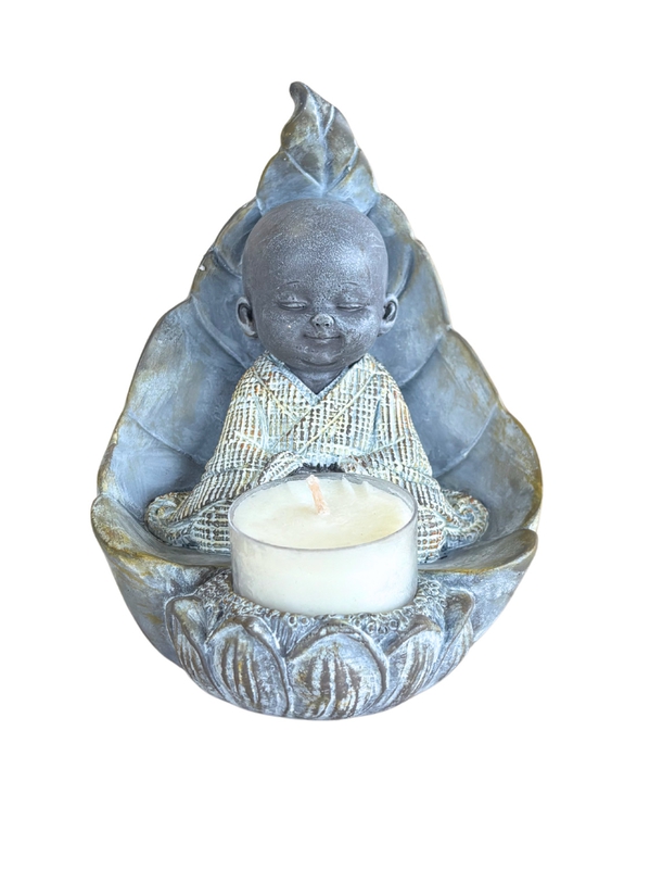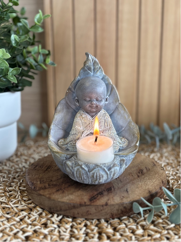Enveloppé dans une feuille protectrice, les yeux clos, le moine repose dans une profonde méditation. Sa présence inspire la sérénité et la connexion à l'instant présent. Devant lui, un porte-bougie attend la flamme. Réalisé en résine grise, ce porte-bougie invite à la méditation, à l'écoute intérieure et à la paix profonde. Il trouve sa place dans une pièce de repos ou pendant des moments de calme et de méditation.