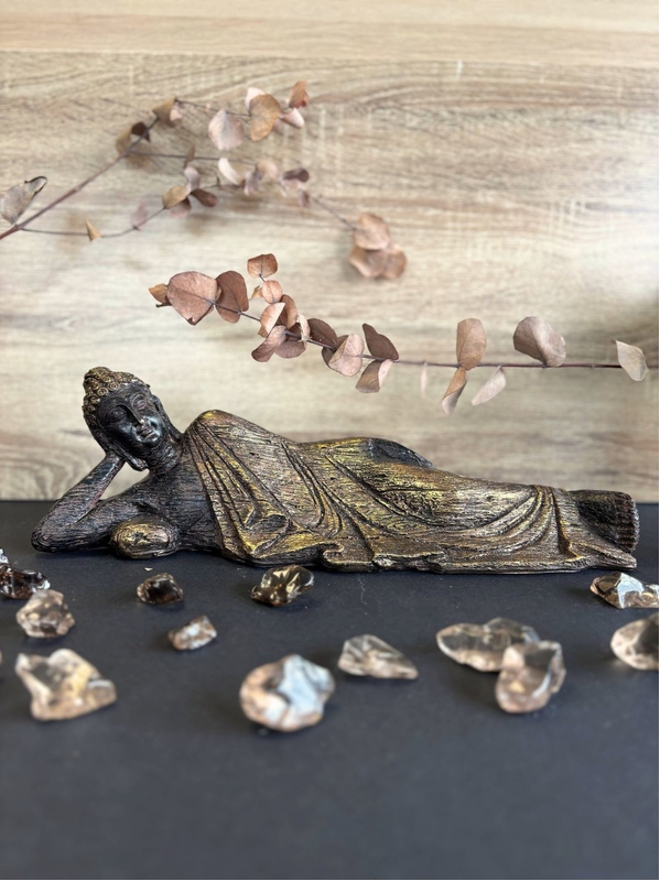 Dans chaque espace, une statue de Bouddha porte le silence du monde. Ni imposant, ni bruyant, sa présence apaise. Sa posture, allongée, représente le moment du Nirvana, symbole de paix et de libération de la souffrance. Allongé, Bouddha incarne la fin du désir et l'atteinte d'une tranquillité profonde, un état d'équilibre parfait entre le corps et l'esprit. Placer cette statuette en résine dans votre intérieur, c'est inviter la paix et la sagesse dans chaque recoin. Orienté vers la porte, il attire la lumière et la chance , dans l'intimité, il guide vos pensées vers la sérénité.