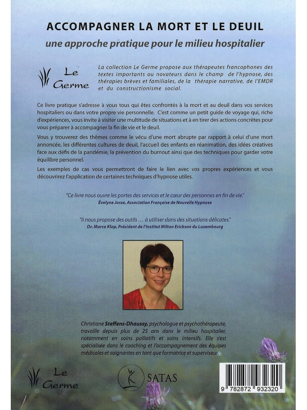 Ce livre pratique s'adresse à vous tous qui êtes confrontés à la mort et au deuil dans vos services hospitaliers ou dans votre propre vie personnelle. C'est comme un petit guide de voyage qui, riche d'expériences, vous invite à visiter une multitude de situations et à en tirer des actions concrètes pour vous préparer à accompagner la fin de vie et le deuil. Vous y trouverez des thèmes comme le vécu d'une mort abrupte par rapport à celui d'une mort annoncée, les différentes cultures de deuil, l'accueil des enfants en réanimation, des idées créatives face aux défis de la pandémie, la prévention du burnout ainsi que des techniques pour garder votre équilibre personnel. Les exemples de cas vous permettront de faire le lien avec vos propres expériences et vous découvrirez l'application de certaines techniques d'hypnose utiles.Steffens-Dhaussy Christiane Voir moins