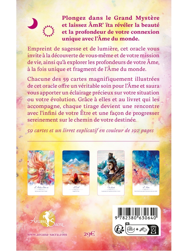 Plongez dans le Grand Mystère et laissez ÂmR’ïta révéler la beauté et la profondeur de votre connexion unique avec l’Âme du monde. Empreint de sagesse et de lumière, cet oracle vous invite à la découverte de vous-même et de votre mission de vie, ainsi qu’à explorer les profondeurs de votre Âme, à la