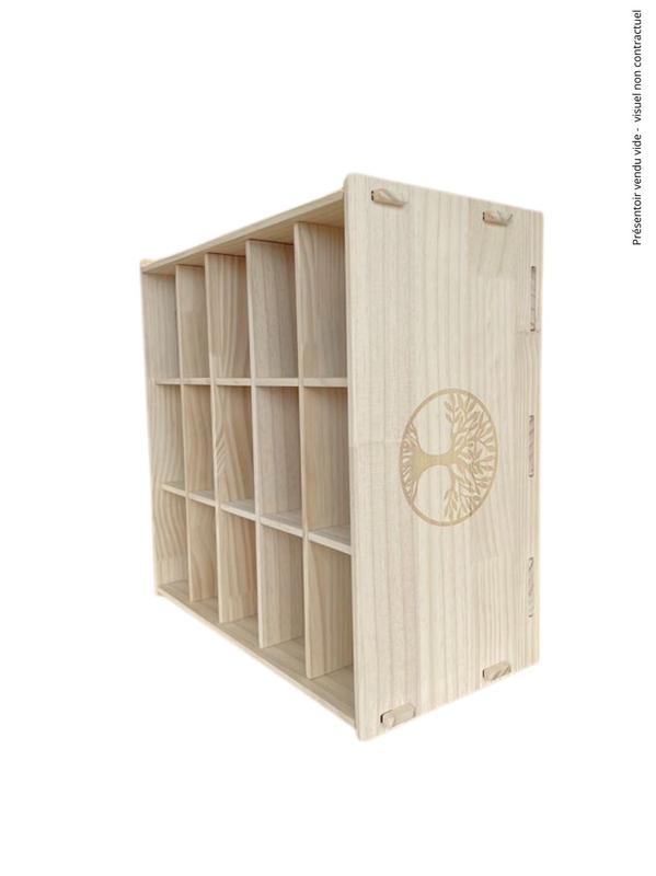 Présentoir en bois 15 cases pour bougies composé de 15 compartiments de 8 x 13cm (profondeur : 22cm). Dimensions du présentoir : 45 x 44 x 28cm. Motif arbre de vie sur les Voir plus