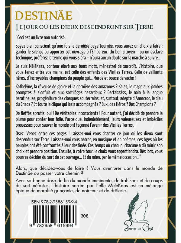 “Ceci est un livre non autorisé. Soyez bien conscient qu’une fois la dernière page tournée, vous aurez un choix à faire : garder le silence ou apporter cet ouvrage à l’Empereur. Un bon citoyen – ou un esclave technique, préférez le terme qui vous siéra – n’aura aucun doute sur la marche à suivre… Je suis MêléKaas, conteur élevé aux bons mots, ménestrel de surcroît. L’histoire, que vous tenez entre vos mains, est celle des enfants des Vieilles Terres. Celle de vaillants héros, d’incroyables champions du peuple qui… Merde et bouse de vache ! Kathelÿne, la rêveuse de gloire et la dernière des amazones ? Kalas, le mage aux jambes promptes à s’enfuir et aux sortilèges hasardeux ? Bartabaäss, le nain à la langue baratineuse, progéniture des cloaques souterrains, et, surtout, adepte d’Anarcroc, le dieu du Chaos ? Et toute la clique qui les a accompagnés ? Eux, des Héros ? Des Champions ? De fieffés abrutis, oui ! De véritables inconscients ! Pour autant, j’ai décidé de prendre la plume pour conter leur folie. Parce que, indéniablement, leurs valeureuses et imbéciles prouesses pour sauver le monde ont façonné l’avenir des Vieilles Terres. Osez. Venez entre ces pages ! Laissez-moi vous chanter ce jour où les dieux sont descendus sur Terre. Laissez-moi vous narrer, en musique et en poèmes, ces âges où les peuples ont été confrontés à leur destinée. Ces temps où chacun, chacune a dû mûrir son choix et prendre position. Ensuite, à votre tour, le choix vous appartiendra. Dès lors, vous pourrez décider du sort de cet ouvrage… Et du mien, par la même occasion…” Alors, que décidez-vous de faire ? Vous aventurer dans le monde de Destinäe ou passer votre chemin ? Avec sa bonne dose de fin du monde imminente, de trahisons et de coups du sort néfastes, l’histoire narrée par l’elfe MêléKaas est un mélange épique de moralité grinçante, de noirceur et de drôlerie.Moslonka Michaël Voir moins