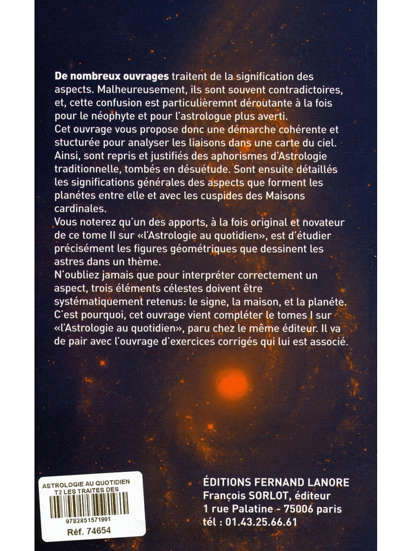 De nombreux ouvrages traitent de la signification des aspects. Malheureusement, ils sont souvent contradictoires, et, cette confusion est particulièrement déroutante à la fois pour le néophyte et pour l'astrologue plus averti. Cet ouvrage vous propose donc une démarche cohérente et structurée pour analyser les liaisons dans une carte du ciel. Ainsi, sont repris et justifiés des aphorismes d'Astrologie traditionnelle, tombés en désuétude. Sont ensuite détaillés les significations générales des aspects que forment tes planètes entre elle et avec les cuspides des Maisons cardinales. Vous noterez qu'un des apports, à la fois original et novateur de ce tome II sur l'Astrologie au quotidien , est d'étudier précisément les figures géométriques que dessinent les astres dans un thème. N'oubliez jamais que pour interpréter correctement un aspect, trois éléments célestes doivent être systématiquement retenus : le signe, la maison et la planète. C'est pourquoi cet ouvrage vient compléter le tome I sur l'Astrologie au quotidien , paru chez le même éditeur. Il va de pair avec l'ouvrage d'exercices corrigés qui lui est associé.Dorbaire Philippe Voir moins