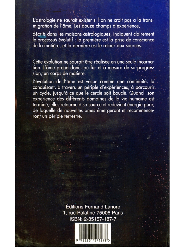 L’astrologie ne saurait exister si l’on ne croit pas à la transmigration de l’âme. Les douze champs d’expérience, décrits dans les maisons, indiquent clairement le processus évolutif : la première est la prise de conscience de la matière, et la dernière est le retour aux sources. Cette évolution ne Voir plus