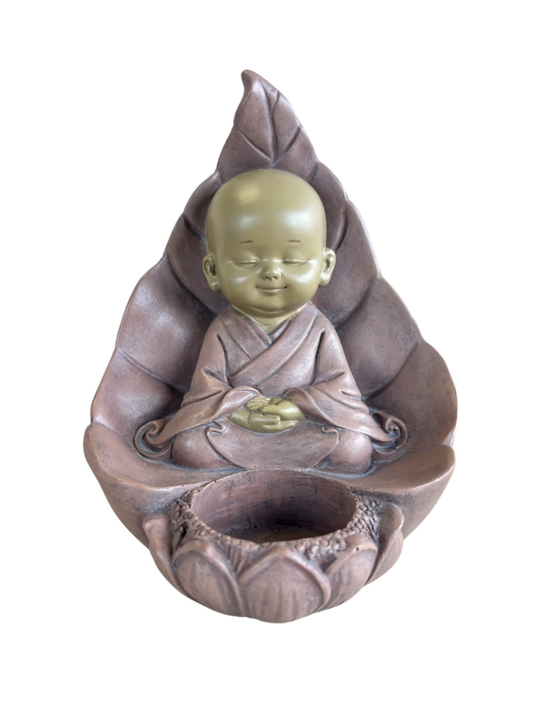 Enveloppé dans une feuille protectrice, les yeux clos, le moine repose dans une profonde méditation. Sa présence inspire la sérénité et la connexion à l'instant présent. Devant lui, un port-bougie attend la flamme. Réalisé en résine dorée, ce porte-bougie invite à la méditation, à l'écoute intérieure et à la paix profonde. Il trouve sa place dans une pièce de repos ou pendant des moments de calme et de méditation.