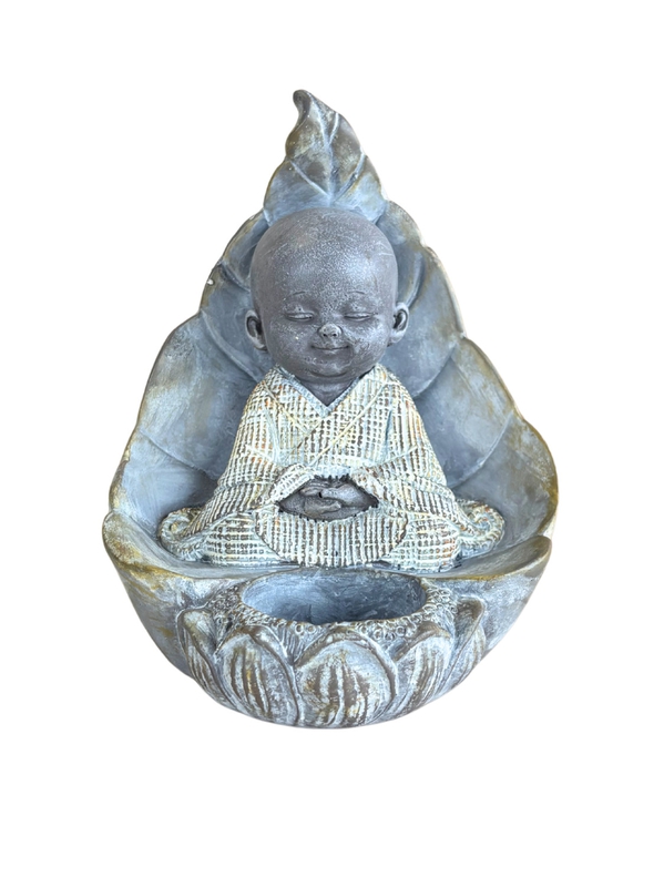 Enveloppé dans une feuille protectrice, les yeux clos, le moine repose dans une profonde méditation. Sa présence inspire la sérénité et la connexion à l'instant présent. Devant lui, un porte-bougie attend la flamme. Réalisé en résine grise, ce porte-bougie invite à la méditation, à l'écoute intérieure et à la paix profonde. Il trouve sa place dans une pièce de repos ou pendant des moments de calme et de méditation.