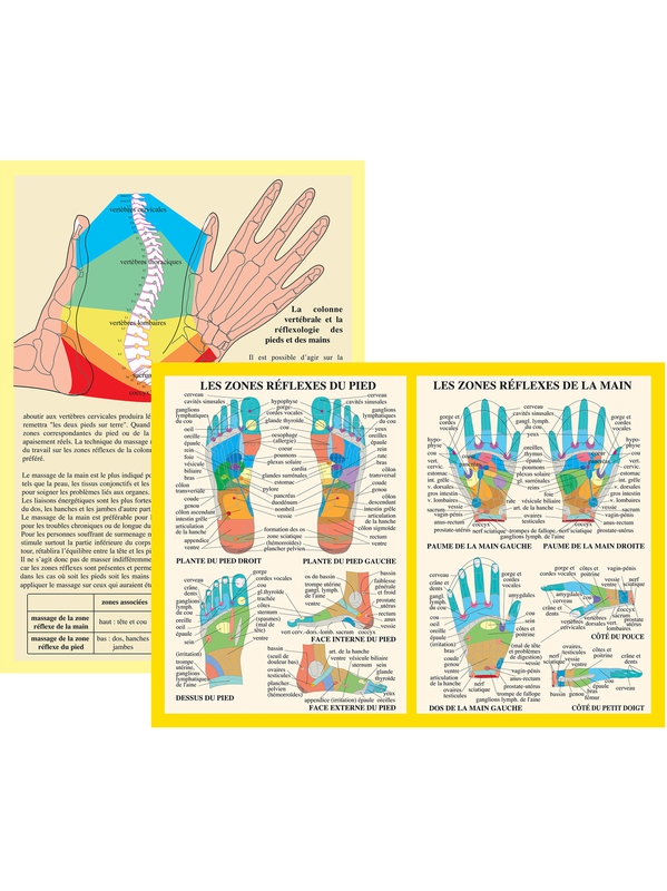 Tous les points de réflexologie pour la main : la paume gauche, la paume droite, le dos gauche, le dos droit et pour le pied : les plantes du pied droit et du pied gauche, le dessus du pied, les faces internes et externes du pied.