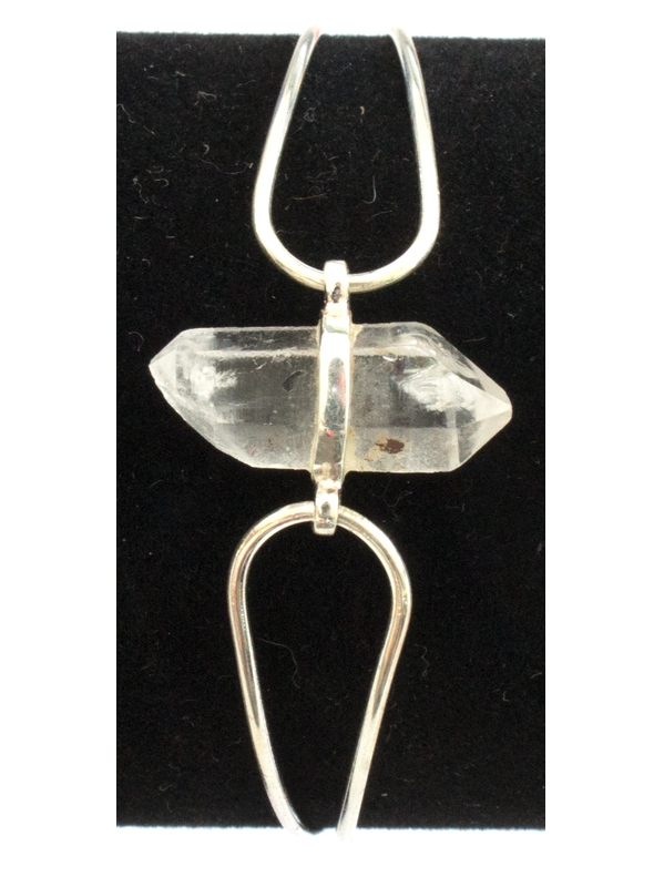 Bracelet en argent surmonté d'une pierre brute Cristal de Roche. Le Cristal de Roche clarifie nos idées et nos émotions en chassant le superflu et renforçant nos convictions, nos idéaux. Il accentue les propriétés des pierres qui l'accompagnent et leur confère plus de puissance lorsque leurs effets Voir plus