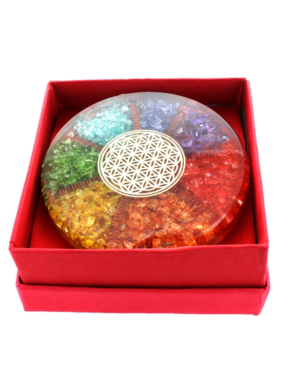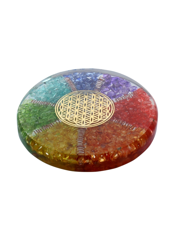 Sous verre Orgonite 7 Chakras et Fleur de Vie en métal. L'Orgonite est un assemblage de pierres semi-précieuses, de résine et de particules de métal. Elle est connue pour lutter contre les pollutions électromagnétiques mais aussi pour augmenter le taux vibratoire d'un lieu ou d'une personne. Elle accumulerait les énergies négatives pour les renvoyer en énergies positives (par l'action des pierres contenues). Elle aiderait pendant la méditation à recentrer et régénérer l'énergie vitale (agirait sur les chakras racine et couronne). Voir moins