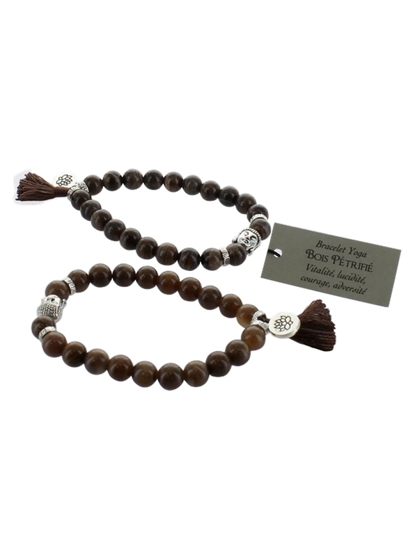 Bracelet Yoga Bois Pétrifié avec un pompon et une médaille Lotus. Diamètre des perles : 8 mm. Bienfaits du Bois Pétrifié : Il apporte une grande vitalité, il permet de surmonter au mieux les situations stressantes. C'est un fantastique réservoir de vie qui permet l'accès à des connaissances mystérie Voir plus
