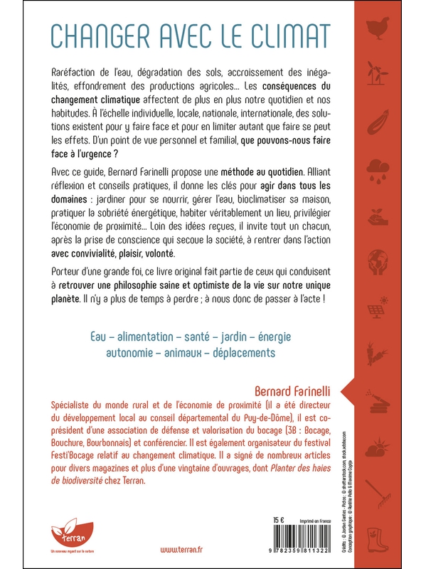 Les conséquences du changement climatique affectent de plus en plus notre quotidien et nos habitudes. À l’échelle individuelle, locale, nationale, internationale, des solutions existent pour y faire face et pour en limiter autant que faire se peut les effets. D’un point de vue personnel et familial, que pouvons-nous faire face à l’urgence ? Avec ce guide, Bernard Farinelli propose une méthode au quotidien. Alliant réflexion et conseils pratiques, il donne les clés pour agir dans tous les domaines : eau, alimentation, santé, jardin, énergie, autonomie, animaux, déplacements… Loin des idées reçues, il invite tout un chacun, après la prise de conscience qui secoue la société, à rentrer dans l’action avec convivialité, plaisir, volonté. Porteur d’une grande foi, ce livre original fait partie de ceux qui conduisent à retrouver une philosophie saine et optimiste de la vie sur notre unique planète. Il n’y a plus de temps à perdre , à nous donc de passer à l’acte !Farinelli Bernard Voir moins
