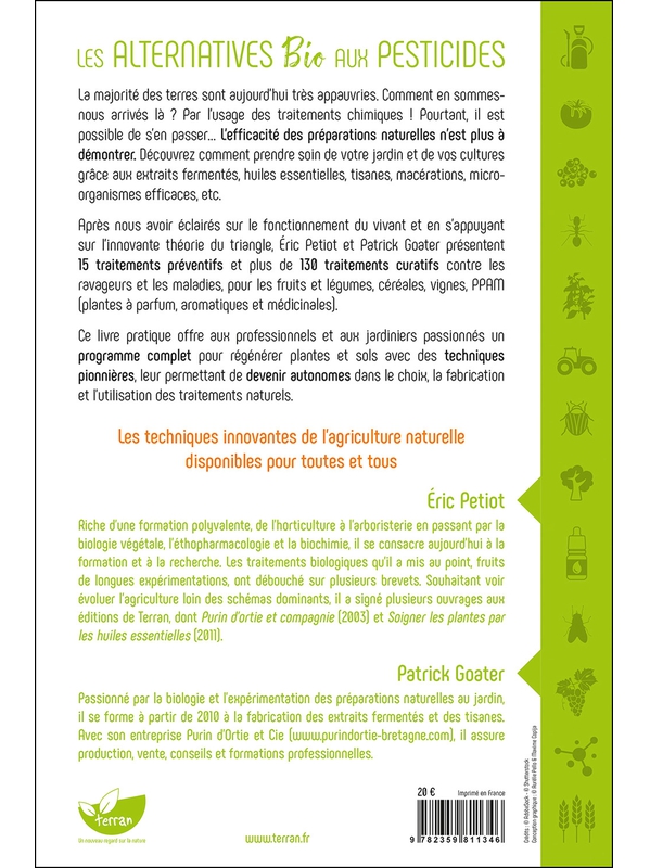 La majorité des terres sont aujourd’hui très appauvries. Comment en sommes-nous arrivés là ? Par l’usage des traitements chimiques ! Pourtant, il est possible de s’en passer… L’efficacité des préparations naturelles n’est plus à démontrer. Découvrez comment prendre soin de votre jardin et de vos cultures grâce aux extraits fermentés, huiles essentielles, tisanes, macérations, micro-organismes efficaces, etc. Après nous avoir éclairés sur le fonctionnement du vivant et en s’appuyant sur l’innovante théorie du triangle, Éric Petiot et Patrick Goater présentent 15 traitements préventifs et plus de 130 traitements curatifs contre les ravageurs et les maladies, pour les fruits et légumes, céréales, vignes… Ce livre pratique offre aux professionnels et aux jardiniers passionnés un programme complet pour régénérer plantes et sols avec des techniques pionnières, leur permettant de devenir autonomes dans le choix, la fabrication et l’utilisation des traitements naturels.Petiot Éric,Goater Patrick Voir moins