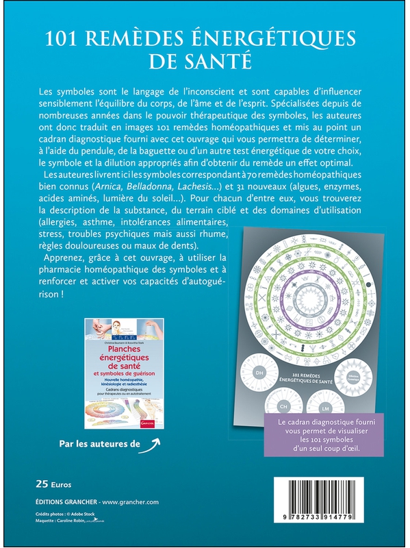 Spécialisées depuis de nombreuses années dans le pouvoir thérapeutique des symboles, les auteures ont traduit en images 101 remèdes homéopathiques et mis au point un cadran diagnostique fourni avec cet ouvrage qui vous permettra de déterminer, à l’aide du pendule, de la baguette ou d’un autre test é