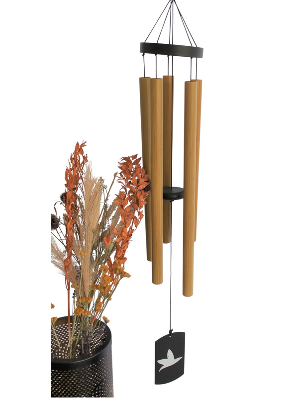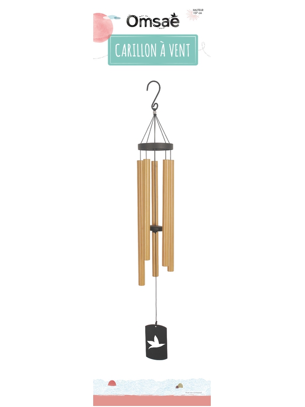Carillon à vent composé de 5 tubes en aluminium. Il représente la Terre, attire le bon Chi et la prospérité. Chaque tube a été soigneusement accordé pour libérer les notes Mi, Fa, Sol, Si, Do et offrir une douce mélodie. Élégamment décoré d'un motif imitant le bois de bambou et de l'oiseau Omsaé, guide dans la quête d'épanouissement de soi, ce carillon saura séduire par son design épuré et trouvera sa place dans tout intérieur. En Feng Shui, le carillon est un objet traditionnel largement utilisé pour l'harmonie qu'il apporte.
