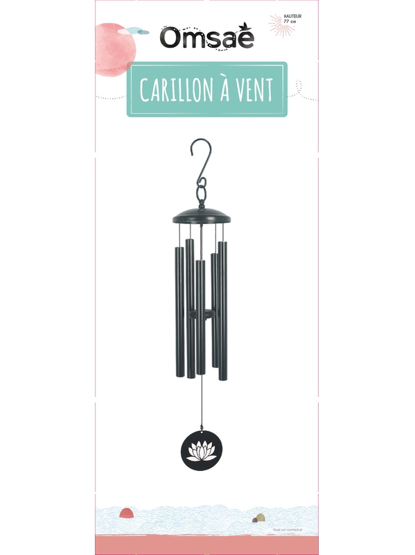 Carillon à vent avec 5 tubes motif lotus. Notes : Si – Do – Ré – Fa – Sol. Crochet en S en aluminium. Crochet anneau en acier inoxydable. Capot supérieur noir, tubes et anneau noir en aluminium. Partie basse en acrylique. Cordes en nylon. Dimensions : 14,5 x 14,5 x 77 cm. Utilisation en intérieur et en extérieur.