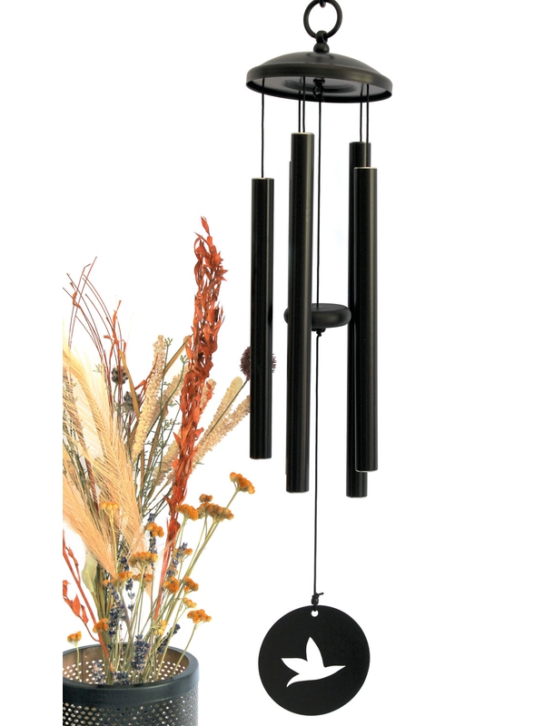 Carillon à vent avec 5 tubes motif oiseau. Notes : Si – Do – Ré – Fa – Sol. Crochet en S en aluminium. Crochet anneau en acier inoxydable. Capot supérieur noir, tubes et anneau noir en aluminium. Partie basse en acrylique. Cordes en nylon. Dimensions : 14,5 x 14,5 x 77 cm. Utilisation en intérieur et en extérieur.