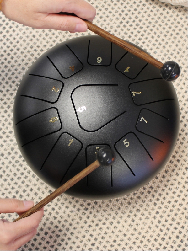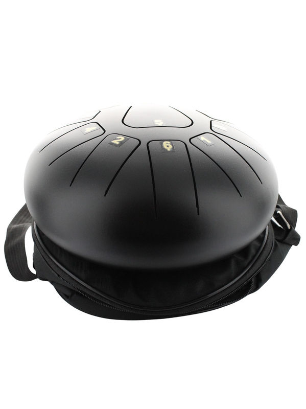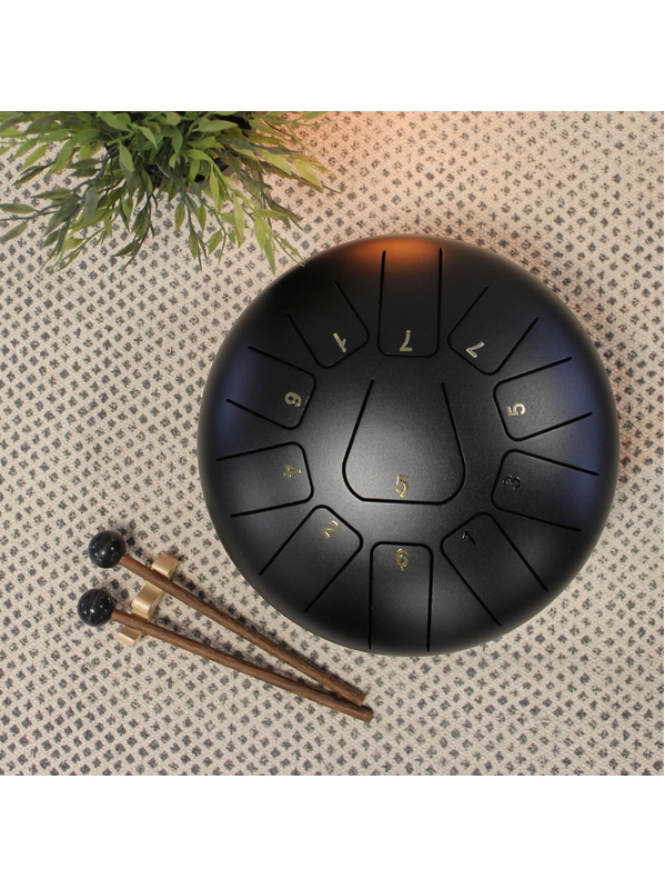 Tongue drum noir en acier inoxydable. 11 notes : Sol mineur - La mineur - Si mineur - Do - Ré - Mi - Fa - Sol - La - Si - Do majeur. Diamètre : envrino 25 cm. 2 maillets en bois avec boule en caoutchouc. Longueur : 21 cm. Housse noire de protection et transport fournie.
