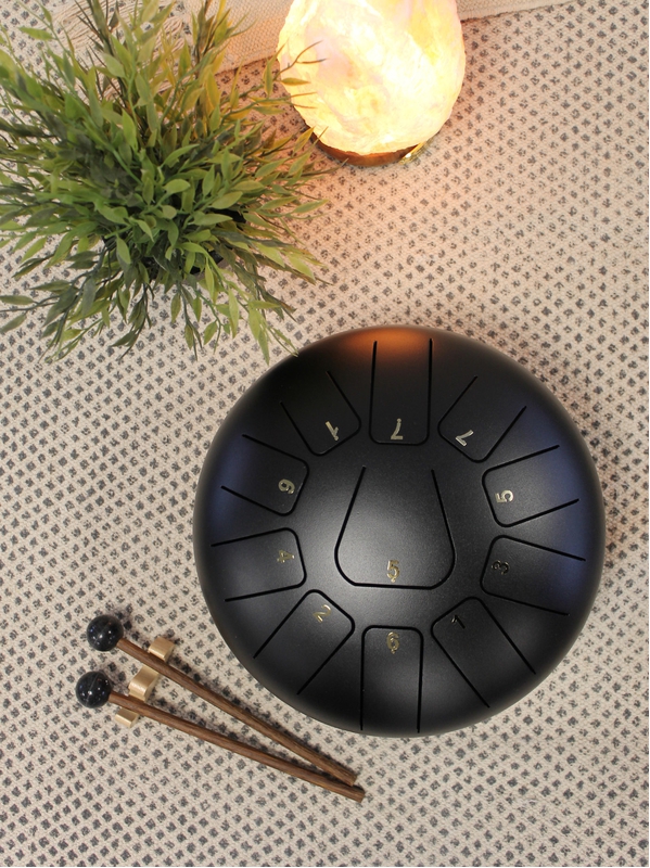 Instrument de musique intriguant, ce tongue drum noir accompagnera avec sa mélodie envoûtante les séances de méditation, de relaxation ou de yoga. Les sonorités profondes et intenses qu'il libère résonnent dans le corps de chacun, rééquilibrent les fréquences et favorisent la détente. Nul besoin d'être un grand musicien, cet instrument de musique est très intuitif et simple d'utilisation. Sa forme bombée et le matériau utilisé créent une belle caisse de résonnance. Sur le dessus de ce tongue drum, 11 langues ont été taillées avec précision pour offrir une gamme mineure, propice à l'apaisement. Au moindre coup de maillet, chacune d'elles libère une note spécifique.