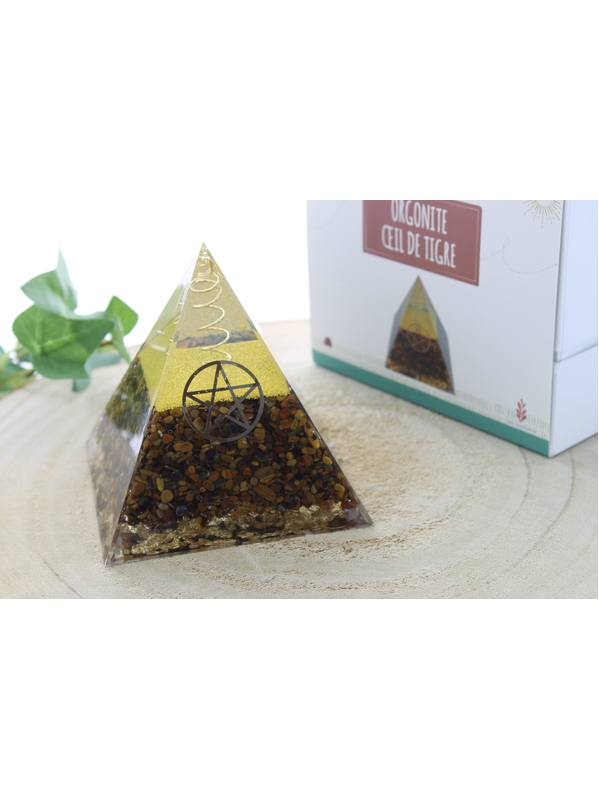 Orgonite en forme de pyramide en pierre naturelle d'oeil de tigre et d'une médaille finition dorée au symbole pentacle. C'est l'assemblage d'éléments fondamentaux comme les minéraux et les particules de métal qui donnent à l'orgonite ses caractéristiques exceptionnelles. Véritable filtre à ondes, cette pyramide capte les énergies du cosmos, les amplifie et les diffuse. L'œil de tigre accentue la confiance en soi et charge en énergie le corps émotionnel. Élégamment ornée d'un pentacle, symbole protecteur représentant la domination de l'esprit sur la matière, cette orgonite saura trouver sa place dans tout intérieur.
