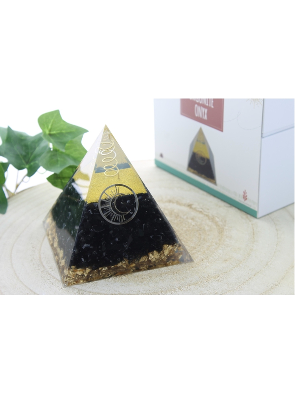 Orgonite en forme de pyramide en pierre naturelle d'onyx et d'une médaille finition dorée au symbole lune. C'est l'assemblage d'éléments fondamentaux comme les minéraux et les particules de métal qui donnent à l'orgonite ses caractéristiques exceptionnelles. Véritable filtre à ondes, cette pyramide capte les énergies du cosmos, les amplifie et les diffuse. Pierre d'enracinement à la terre, l’onyx noir ancre en aidant à garder le contrôle de soi. Élégamment ornée d'un croissant de lune, symbole du féminin sacré qui éclaire l’inconscient et les émotions, cette orgonite saura trouver sa place dans tout intérieur.