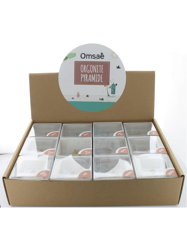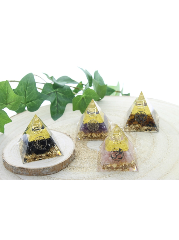 Boîte individuelle avec une orgonite en forme de pyramide en pierre naturelle et d'une médaille finition dorée : améthyste au symbole fleur de vie, labradorite au symbole arbre de vie, oeil de tigre au symbole pentacle ou onyx au symbole lune. C'est l'assemblage d'éléments fondamentaux comme les minéraux et les particules de métal qui donnent à l'orgonite ses caractéristiques exceptionnelles. Véritable filtre à ondes, cette pyramide capte les énergies du cosmos, les amplifie et les diffuse.