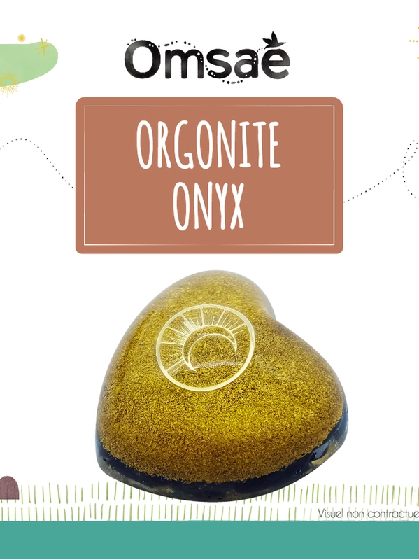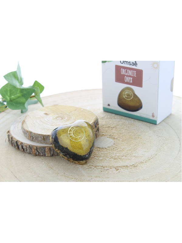 Orgonite en forme de cœur en pierre naturelle d'onyx et d'une médaille finition dorée au symbole lune. C'est l'assemblage d'éléments fondamentaux comme les minéraux et les particules de métal qui donnent à l'orgonite ses caractéristiques exceptionnelles. Véritable filtre à ondes, ce coeur orgonite, symbole du centre émotionnel et de l'essentiel, transformera les énergies négatives en énergies positives. Pierre d'enracinement à la terre, l’onyx noir aide à garder le contrôle de soi. Le croissant de lune qui la décore éclaire l’inconscient et les émotions.