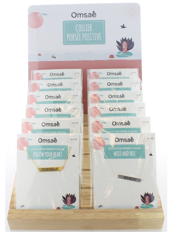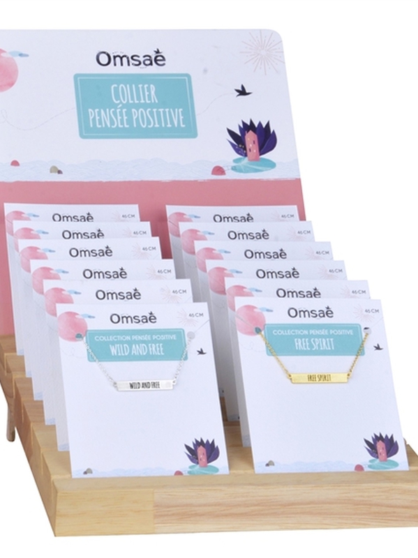 Cartonnette imprimée. Conditionné dans un présentoir en bois à monter (4 vis) de 12 colliers. Dimensions du présentoir : 20 x 22.5 x 8.5 cm.