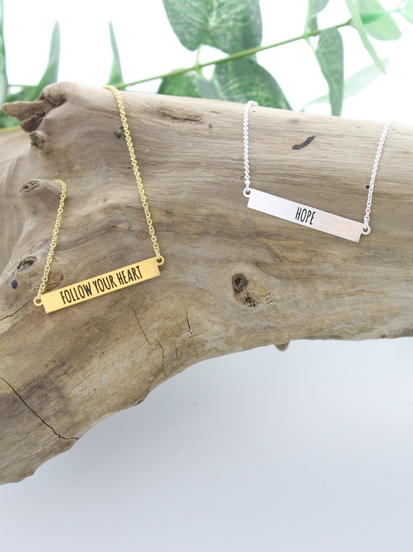 Collier en laiton placage doré ou argent. Dimensions : plaque : 3 x 0,5 cm et chaîne : 40,6 cm avec attache ajustable : 5 cm.