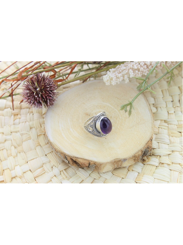 Bague Alaka en argent ornée d'une pierre naturelle d'améthyste bombée. Pierre de la sagesse, l'améthyste dissipe les peurs et apporte la sérénité. Elle ouvre l’imaginaire et développe la créativité et l'intuition. Elle est aussi utilisée pour purifier les lieux et les objets.