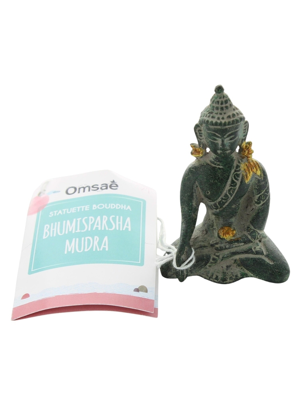 Statuette Bouddha Varada mudra en laiton finition vert antique. Dimensions : 4 x 7,5 x 5,3 cm. Utilisation en intérieur uniquement.