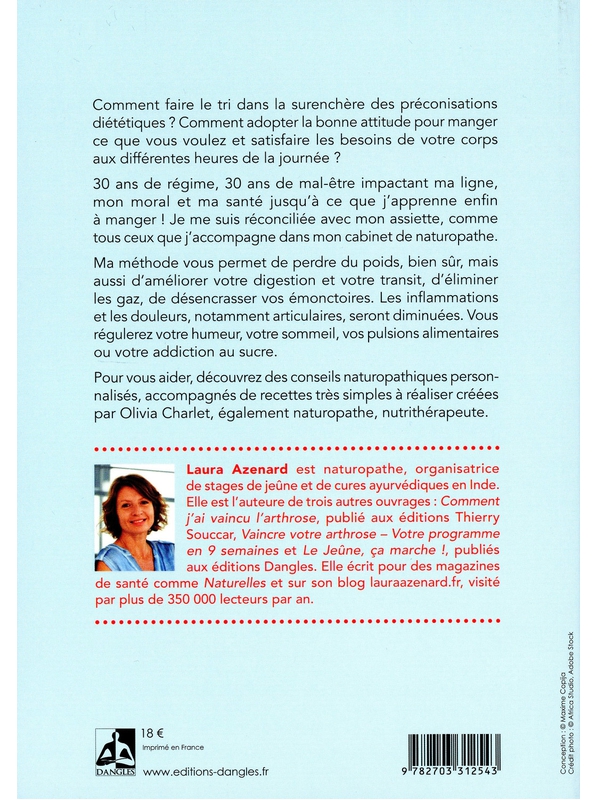 Comment faire le tri dans la surenchère des préconisations diététiques ? Comment adopter la bonne attitude pour manger ce que vous voulez et satisfaire les besoins de votre corps aux différentes heures de la journée ? 30 ans de régime, 30 ans de mal-être impactant ma ligne, mon moral et ma santé jusqu’à ce que j’apprenne enfin à manger ! Je me suis réconciliée avec mon assiette, comme tous ceux que j’accompagne dans mon cabinet de naturopathe. Ma méthode vous permet de perdre du poids, bien sûr, mais aussi d’améliorer votre digestion et votre transit, d’éliminer les gaz, de désencrasser vos émonctoires. Les inflammations et les douleurs, notamment articulaires, seront diminuées. Vous régulerez votre humeur, votre sommeil, vos pulsions alimentaires ou votre addiction au sucre. Pour vous aider, découvrez des conseils naturopathiques personnalisés, accompagnés de recettes très simples à réaliser créées par Olivia Charlet, également naturopathe, nutrithérapeute.Azenard Laura Voir moins