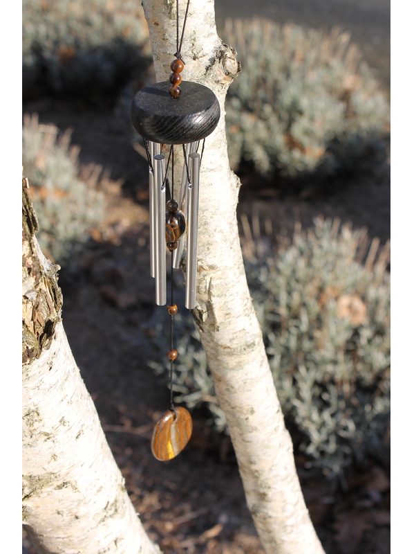Carillon à vent composé de 4 tubes en aluminium et de pierre naturelle d'oeil de tigre. Cette pierre a été soigneusement sélectionnée car elle favorise l'h