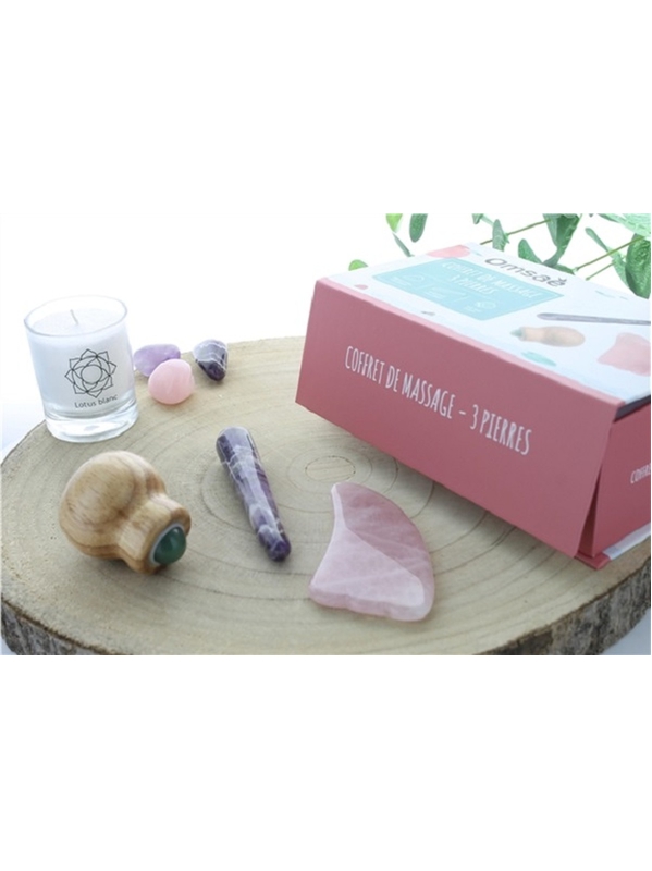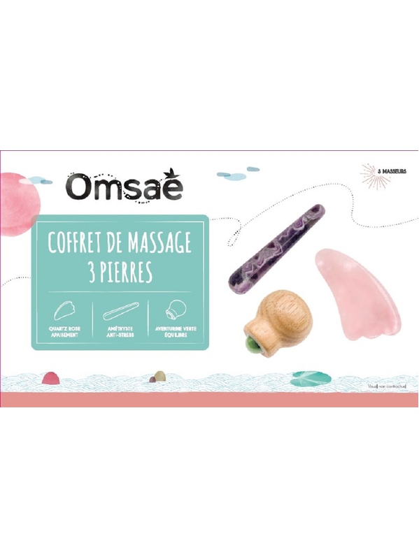 Coffret de massage lithothérapie pour le corps en quartz rose, améthyste et aventurine verte Omsaé