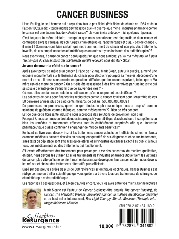 Linus Pauling, le seul homme qui a reçu deux fois le prix Nobel (Prix Nobel de chimie en 1954 et de la Paix en 1962), a dit?: « tout le monde devrait savoir que « la guerre » que mène l’industrie pharmacie contre le cancer est une énorme fraude ». Avait-il raison ? Je vous invite à découvrir ici quelques réponses. C’est toujours la même histoire?: quelqu’un que nous connaissons est diagnostiqué d’un cancer et commence alors le carnaval des chirurgies, chimiothérapies, radiothérapies et puis, « pas de chance », il meurt ! Sommes-nous bien certain que notre ami est mort du cancer et non pas des traitements invasifs, de ces empoisonnantes chimiothérapies ou autres rayons ionisants des radiothérapies ? Nous avons tous, à cause du cancer, perdu quelqu’un que nous aimions, j’ai vu ma mère mourir à petit feu non pas du cancer, mais des traitements qu’elle recevait, nous dit Mark Sloan.Sloan Mark Voir moins