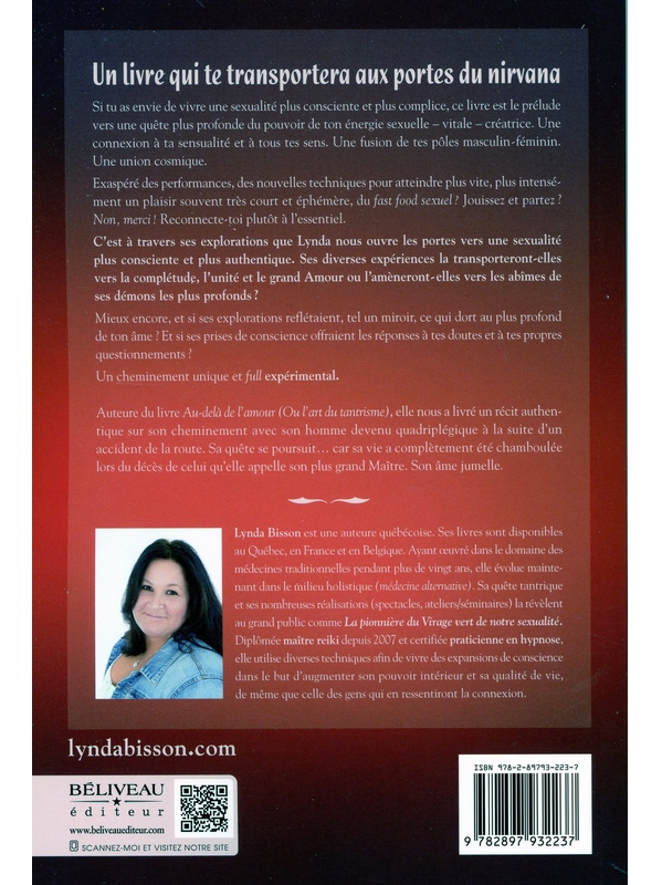 Si tu as envie de vivre une sexualité plus consciente et plus complice, ce livre est le prélude vers une quête plus profonde du pouvoir de ton énergie sexuelle – vitale – créatrice. Une connexion à ta sensualité et à tous tes sens. Une fusion de tes pôles masculin-féminin. Une union cosmique. Exaspéré des performances, des nouvelles techniques pour atteindre plus vite, plus intensément un plaisir souvent très court et éphémère, du fast food sexuel ? Jouissez et partez ? Non, merci ! Reconnecte-toi plutôt à l’essentiel. C’est à travers ses explorations que Lynda nous ouvre les portes vers une sexualité plus consciente et plus authentique. Ses diverses expériences la transporteront-elles vers la complétude, l’unité et le grand Amour ou l’amèneront-elles vers les abîmes de ses démons les plus profonds? Mieux encore, et si ses explorations reflétaient, tel un miroir, ce qui dort au plus profond de ton âme? Et si ses prises de conscience offraient les réponses à tes doutes et à tes propres questionnements ? Un cheminement unique et full expérimental. Auteure du livre « Au-delà de l’amour (Ou l’art du tantrisme) », elle nous a livré un récit authentique sur son cheminement avec son homme devenu quadriplégique à la suite d’un accident de la route. Sa quête se poursuit… car sa vie a complètement été chamboulée lors du décès de celui qu’elle appelle son plus grand Maître. Son âme jumelle.Bisson Lynda Voir moins