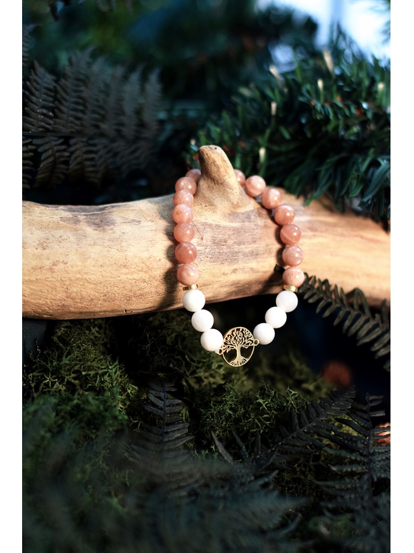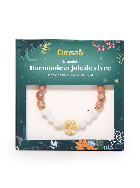 Bracelet harmonie et joie de vivre en perles rondes 8 mm de pierre de lune et pierre de soleil avec charm arbre de vie Omsaé