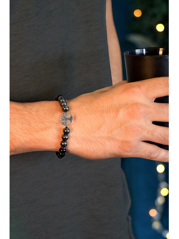 Bracelet Perles rondes 8 mm Hématite et Onyx Charm Arbre de vie