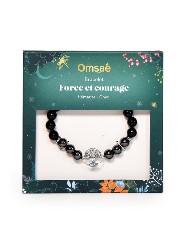 Bracelet force et courage en perles rondes 8 mm d'hématite et d'onyx avec un charm arbre de vie Omsaé
