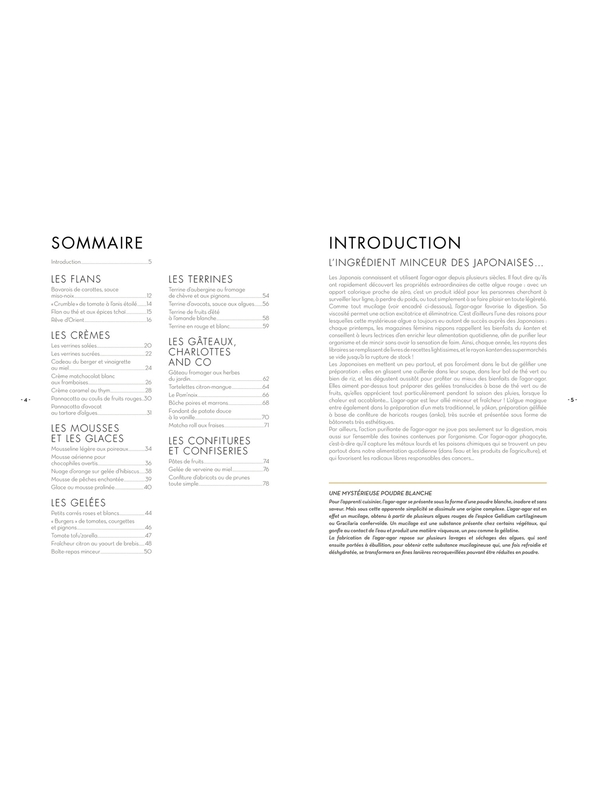 L'agar-agar rencontre un énorme succès au Japon : cette petite poudre blanche gonfle au contact de l'eau et permet de préparer rapidement des plats aux vertus rassasiantes et légèrement laxatives. Chaque printemps les Japonaises - soucieuses de leur ligne - adoptent cet ingrédient à l'apport calorique proche de zéro pour mincir sans subir la sensation de faim, purifier leur organisme, cuisiner vite et léger... Terrine d'aubergines, crème caramel, tartelettes au citron... Clea a retravaillé avec talent des standards gourmands. L'agar-agar lui a permis d'alléger les plats sucrés ou salés en réduisant les quantités de farine, d'oeufs et même de sucre.Clea Voir moins