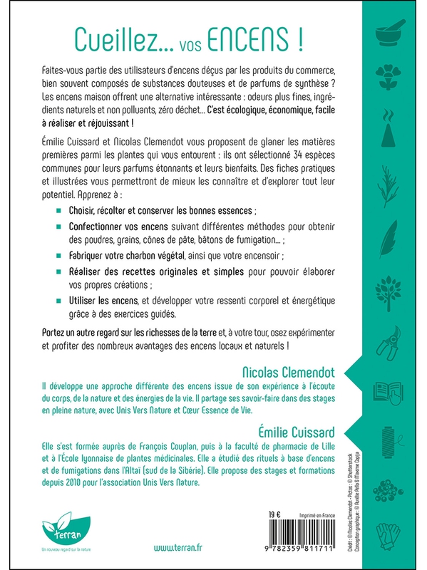 Faites-vous partie des utilisateurs d’encens déçus par les produits du commerce, bien souvent composés de substances douteuses et de parfums de synthèse ? Les encens maison offrent une alternative intéressante : odeurs plus fines, ingrédients naturels et non polluants, zéro déchet… C’est écologique, économique, facile à réaliser et réjouissant ! Émilie Cuissard et Nicolas Clemendot vous proposent de glaner les matières premières parmi les plantes qui vous entourent : ils ont sélectionné 34 espèces communes pour leurs parfums étonnants et leurs bienfaits. Des fiches pratiques et illustrées vous permettront de mieux les connaître et d’explorer tout leur potentiel. Apprenez à : choisir, récolter et conserver les bonnes essences , confectionner vos encens suivant différentes méthodes pour obtenir des poudres, grains, cônes de pâte, bâtons de fumigation… , fabriquer votre charbon végétal, ainsi que votre encensoir , réaliser des recettes originales et simples pour pouvoir élaborer vos propres créations , utiliser les encens, et développer votre ressenti corporel et énergétique grâce à des exercices guidés. Portez un autre regard sur les richesses de la terre et, à votre tour, osez expérimenter et profiter des nombreux avantages des encens locaux et naturels !Clemendot Nicolas,Cuissard Emilie Voir moins