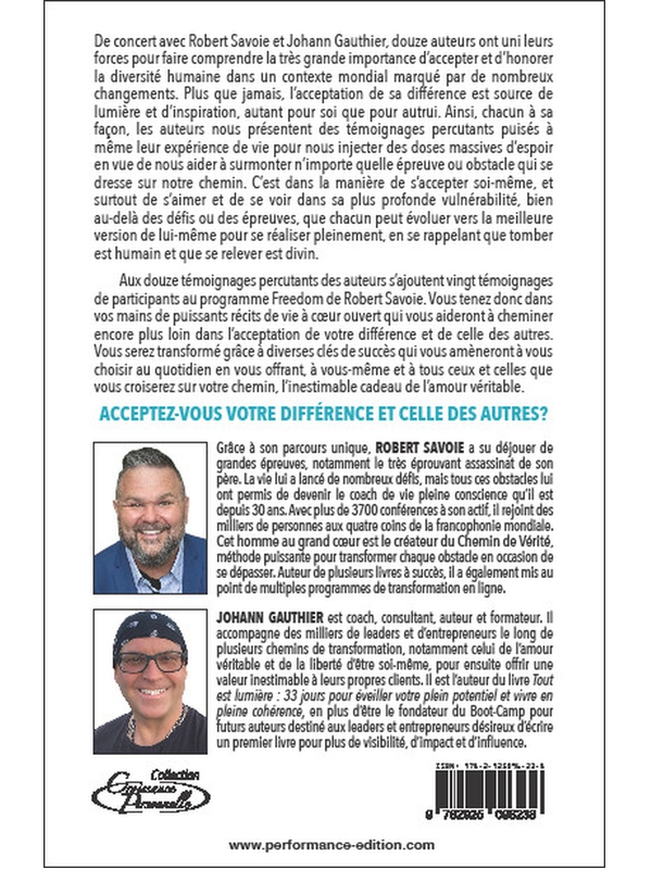 De concert avec Robert Savoie et Johann Gauthier, douze auteurs ont uni leurs forces pour faire comprendre la très grande importance d’accepter et d’honorer la diversité humaine dans un contexte mondial marqué par de nombreux changements. Plus que jamais, l’acceptation de sa différence est source de