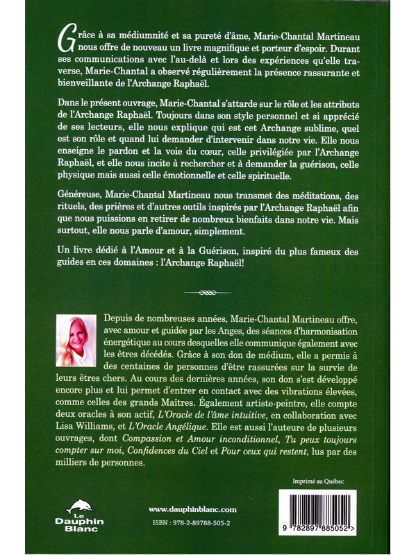 Grâce à sa médiumnité et sa pureté d’âme, Marie-Chantal Martineau nous offre de nouveau un livre magnifique et porteur d’espoir. Durant ses communications avec l’au-delà et lors des expériences qu’elle traverse, Marie-Chantal a observé régulièrement la présence rassurante et bienveillante de l’Archange Raphaël. Dans le présent ouvrage, Marie-Chantal s’attarde sur le rôle et les attributs de l’Archange Raphaël. Toujours dans son style personnel et si apprécié de ses lecteurs, elle nous explique qui est cet Archange sublime, quel est son rôle et quand lui demander d’intervenir dans notre vie. Elle nous enseigne le pardon et la voie du cœur, celle privilégiée par l’Archange Raphaël, et elle nous incite à rechercher et à demander la guérison, celle physique mais aussi celle émotionnelle et celle spirituelle. Généreuse, Marie-Chantal Martineau nous transmet des méditations, des rituels, des prières et d’autres outils inspirés par l’Archange Raphaël afin que nous puissions en retirer de nombreux bienfaits dans notre vie. Mais surtout, elle nous parle d’amour, simplement. Un livre dédié à l’Amour et à la Guérison, inspiré du plus fameux des guides en ces domaines : l’Archange Raphaël !Martineau Marie-Chantal Voir moins