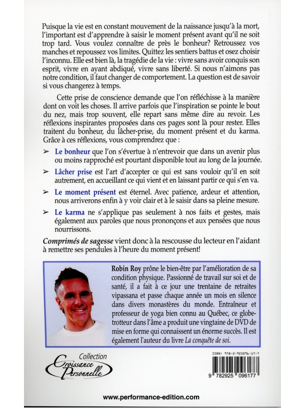 Puisque la vie est en constant mouvement de la naissance jusqu’à la mort, l’important est d’apprendre à saisir le moment présent avant qu’il ne soit trop tard. Vous voulez connaître de près le bonheur? Retroussez vos manches et repoussez vos limites. Quittez les sentiers battus et osez choisir l’inc Voir plus
