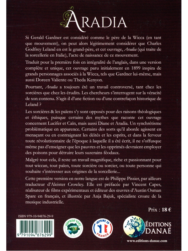 Si Gerald Gardner est considéré comme le père de la Wicca (en tant que mouvement), on peut alors légitimement considérer que Charles Godfrey Leland en est le grand-père, et cet ouvrage, Aradia (qui traite de la sorcellerie en Italie), l'acte de naissance de ce mouvement. Traduit pour la première foi